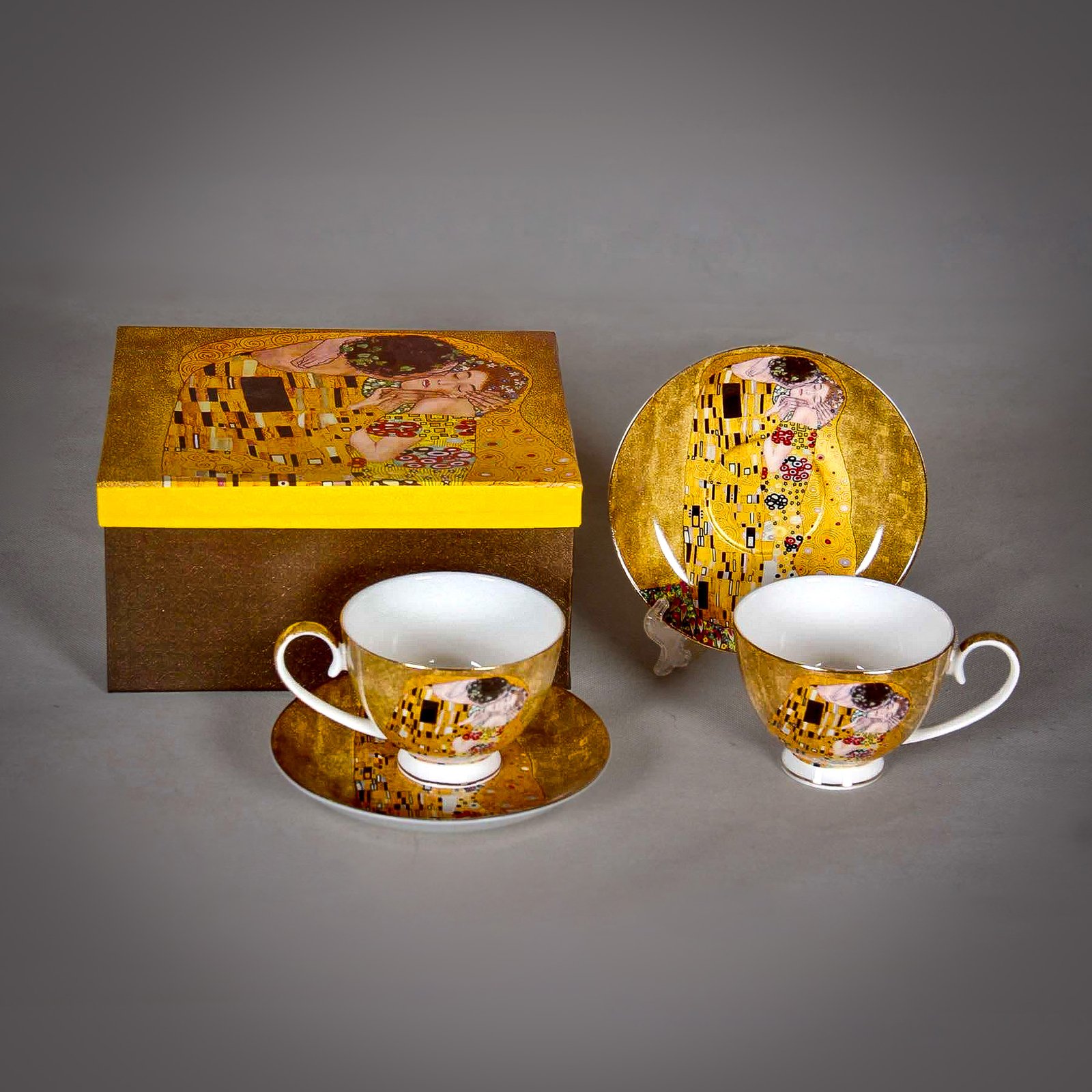 Includes two tea cups, one saucer, and a decorative plate featuring “The Kiss”